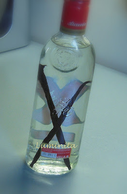 Ieri am cumparat 500 ml de vodka, calitate superioara si 2 batoane de vanilie. Am despicat transversal batoanele de vanilie si le-am aruncat in sticla de vodka. Dupa numai cateva minute vodka mea a inceput sa se coloreze.